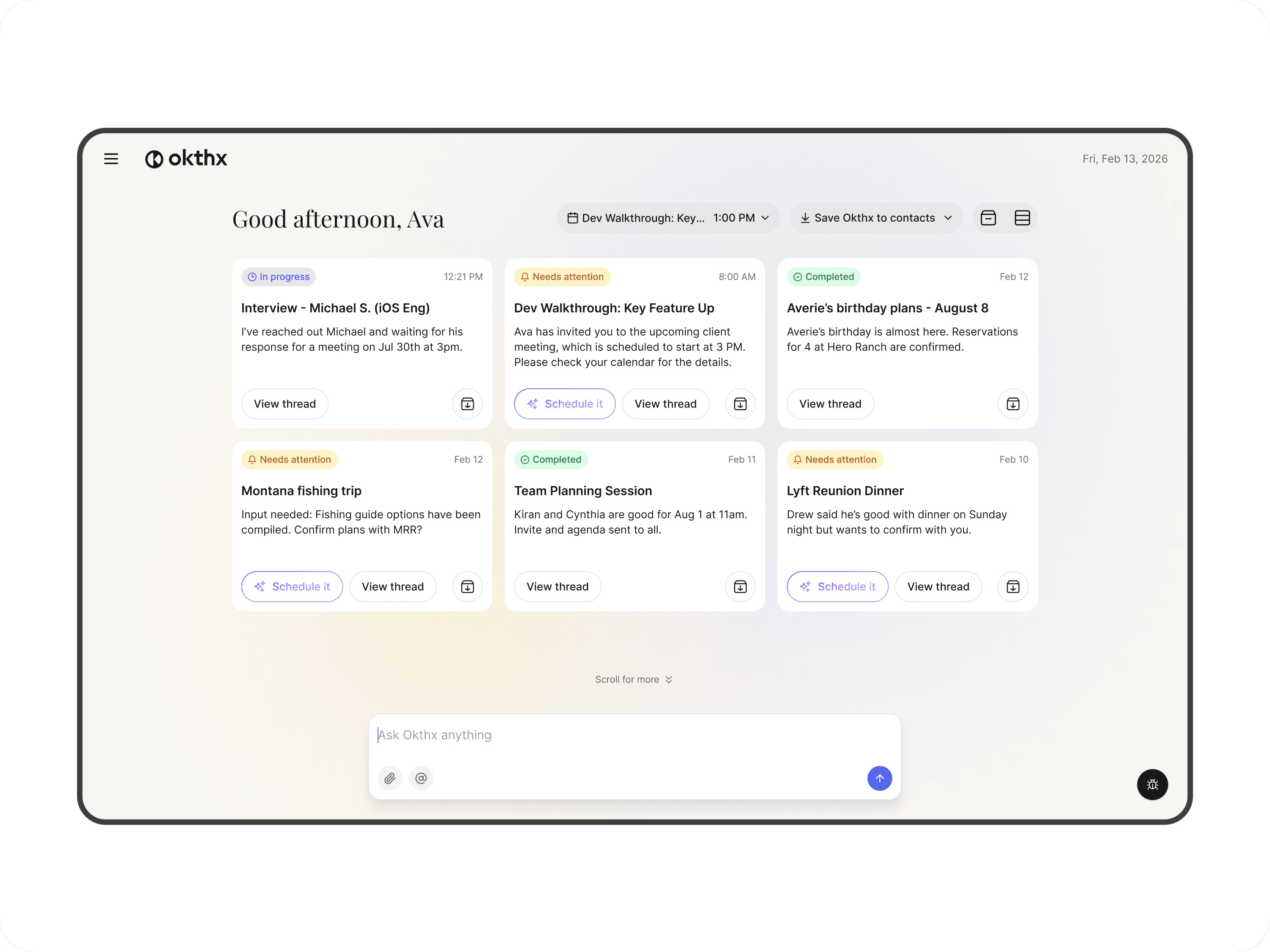 Second, and this is the part we care about most: this kind of help used to be reserved for executives and the wealthy. Having someone manage your calendar, handle your scheduling, coordinate your logistics? That was a luxury. A full-time assistant or a chief of staff. We believe everyone deserves that support, whether you're running a company, running a household, or most likely doing both. Okthx is built to make it accessible to everyone.