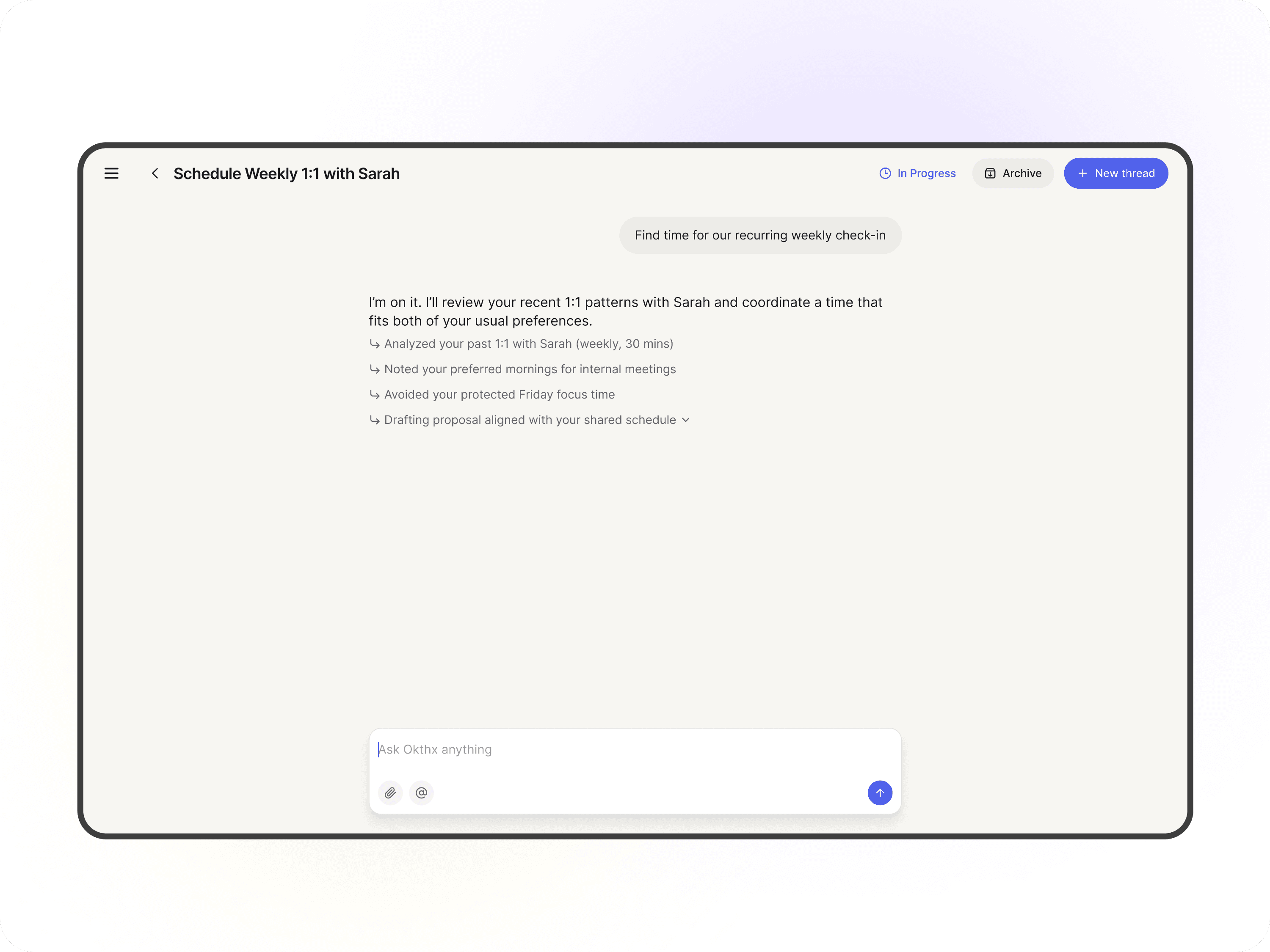Over time, Okthx builds an understanding of your preferences, your relationships, and the patterns that make your life unique. It learns that you protect Friday afternoons for deep work and that your family prefers morning appointments. It gets better the more you use it.