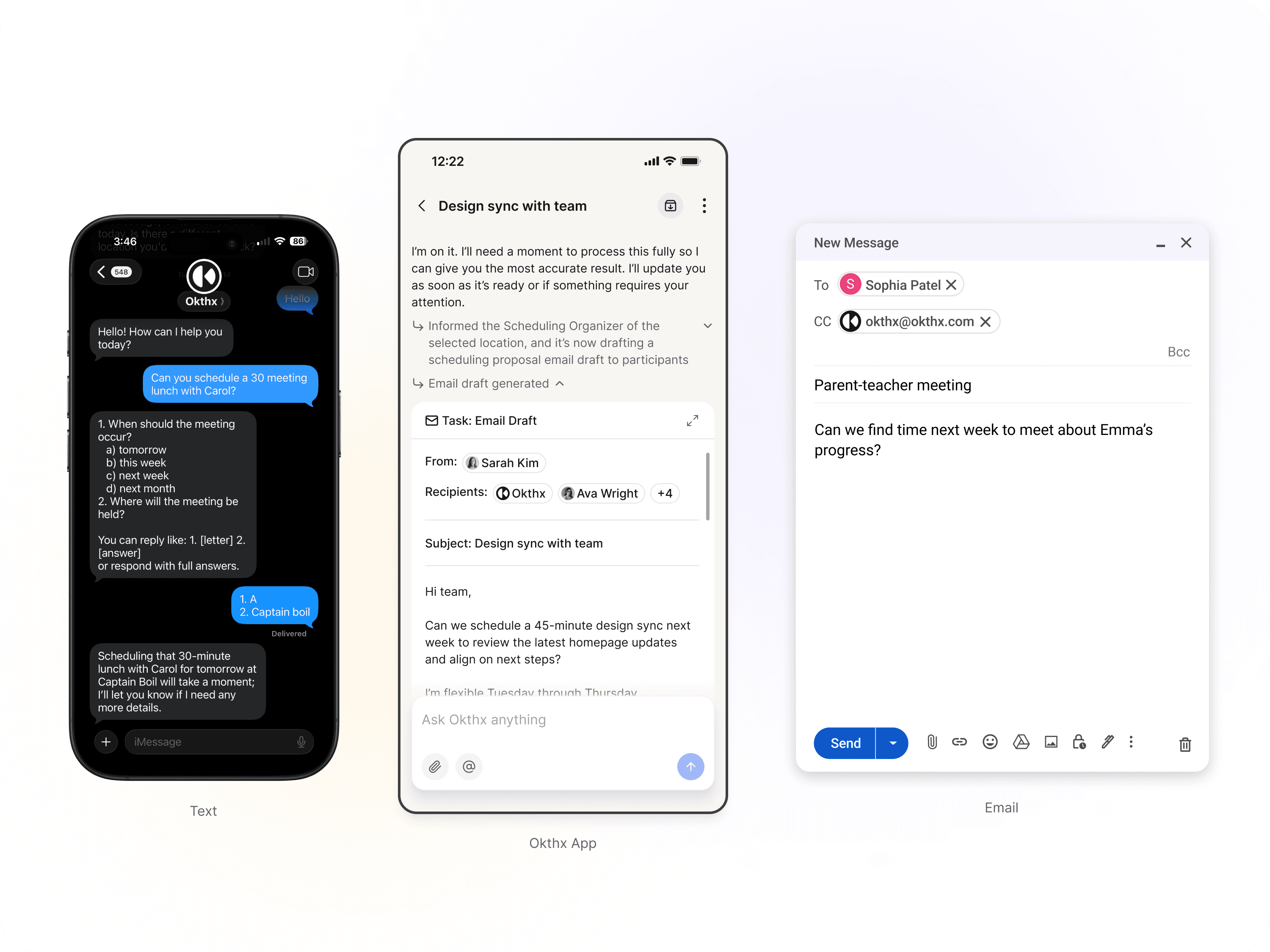 Okthx connects with your email, calendar, and phone. You can text it, email it, or use the app. No new habits required.