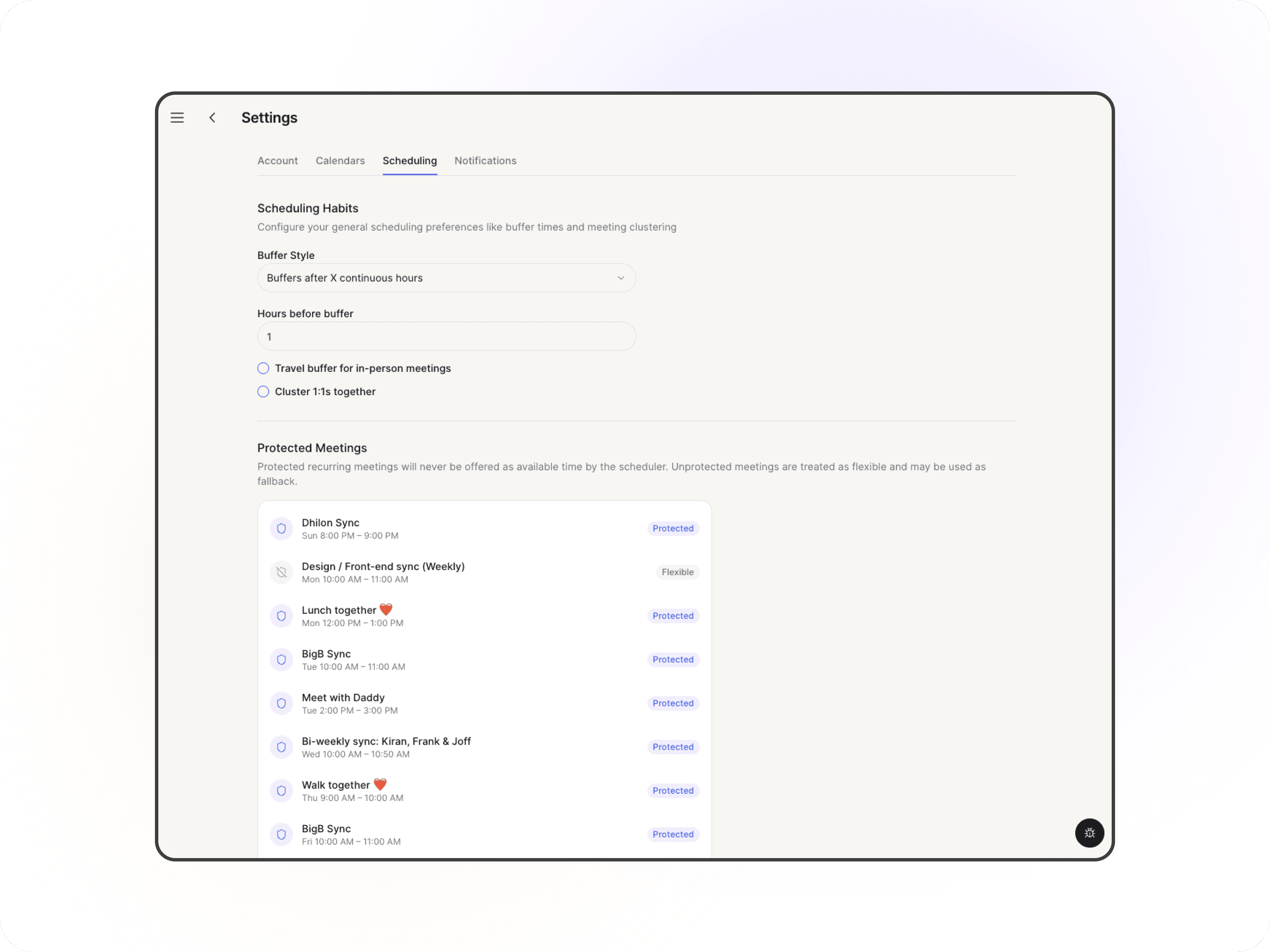 Some recurring meetings are sacred. Others are more like defaults. Now you can tell Okthx which is which, mark a meeting as protected and it stays locked, or leave it unprotected so Okthx can work around it when something more important comes up.