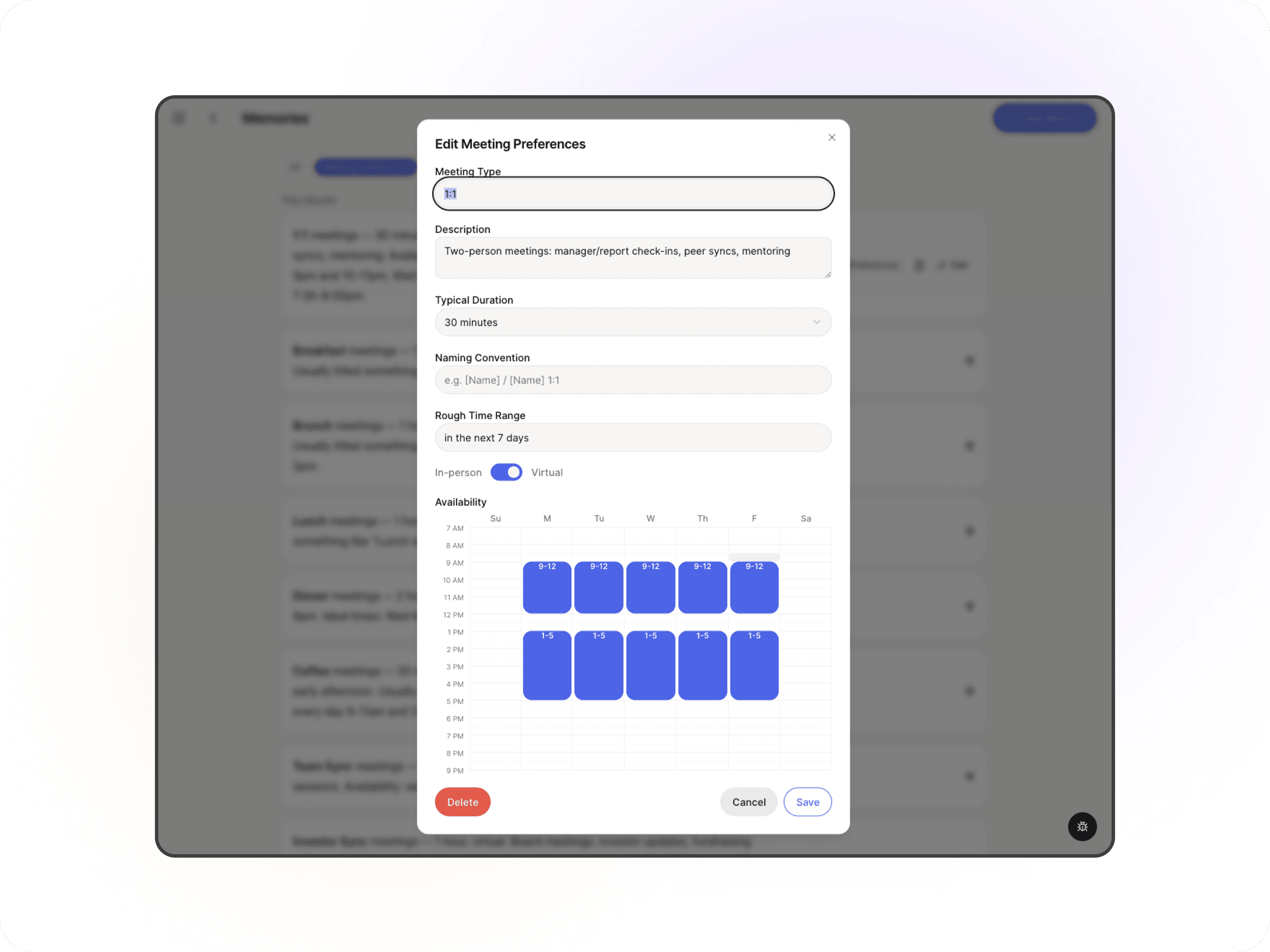You can now tell Okthx how you like to meet, by meeting type. Customer calls are different from 1:1s, which are different from team standups. For each type, you can set availability windows, whether you prefer virtual or in-person, how long meetings should run, and what time of day works best.